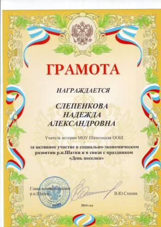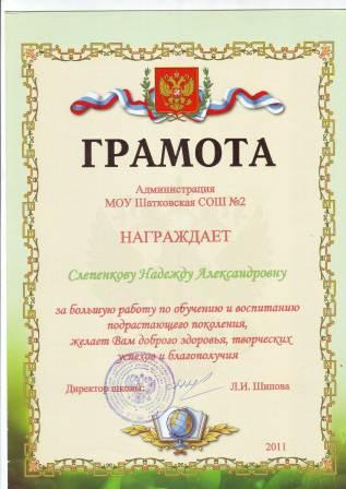 Грамота администрации МОУ Шатковская СОШ №2 за большую работу по обучению и воспитанию подрастающего поколения.