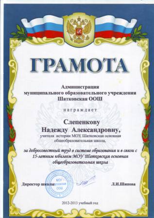 Грамота администрации МОУ Шатковская ООШ за добросовестный труд в системе образования и в связи с 15-летним юбилеем МОУ Шатковская ОШ |