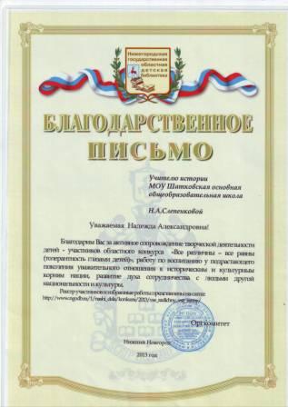 Благодарственное письмо за активное сопровождение творческой деятельности детей - участников областного конкурса "Все различны - все равны", работу по воспитанию у подрастающего поколения уважительного отношения к историческим и культурным корням нации, развитие духа сотрудничества с людьми другой национальности и культуры. |