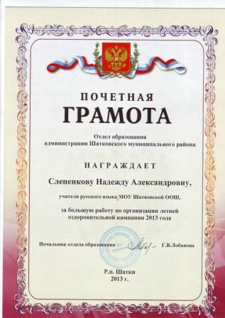 Почетная грамота отдела образования администрации Шатковского муниципального района за большую работу по организации летней оздоровительной кампании 2013 года |