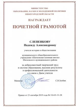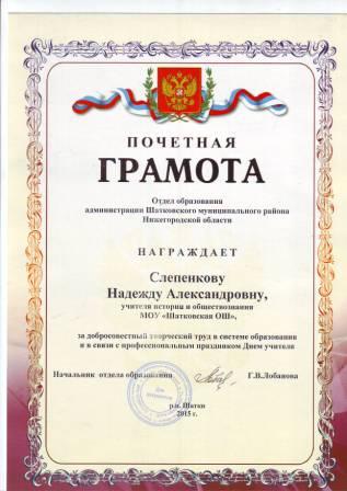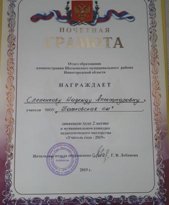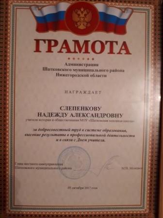 Грамота администрации Шатковского муниципального района Нижегородской области за добросовестный труд в системе образования, высокие результаты в профессиональной деятельности. |