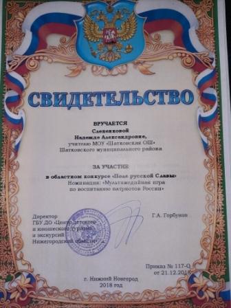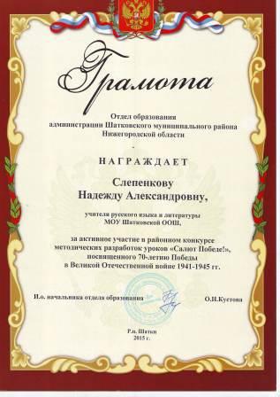 Грамота отдела образования администрации Шатковского муниципального района Нижегородской области за активное участие в районном конкурсе методических разработок уроков "Салют Победе!", посвященного 70-летию победы в Великой Отечественной войне 1941-1945гг. |