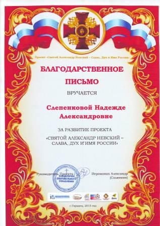 Благодарственное письмо за развитие проекта "Святой Александр Невский - слава, дух и имя России" |