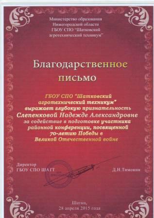 Благодарственное письмо ГБОУ СПО "Шатковский агротехнический техникум" за содействие в подготовке участника районной конференции, посвященной 70-летию Победы в Великой Отечественной войне. |