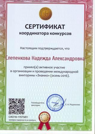 Сертификат координатора конкурса за активное участие в организации и проведении международной викторины "Знанио" |