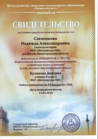 Свидетельство ЦРСГО "Энциклопедист" за подготовку победителя Всероссийской дистанционной полиолимпиады "Советская наука и техника в годы Великой Отечественной войны". |